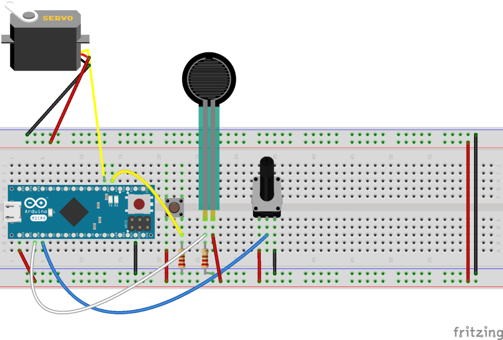 I hooked up the servo on another pin on the Arduino and then connected the FSR to the Arduino too. Fairly basic but still a job for me given my limited experience. I got the FSR to activate the servo and then began trying to figure how to map it correctly. This took a bit of trial and error. Then it was about transplanting this code into the other Arduino sketch in a method I refer to as the Frankenstein. This is where I cobble together a bunch of code and hope for the best and then when it inevitably doesn’t work try to solve the problems through the process of elimination.